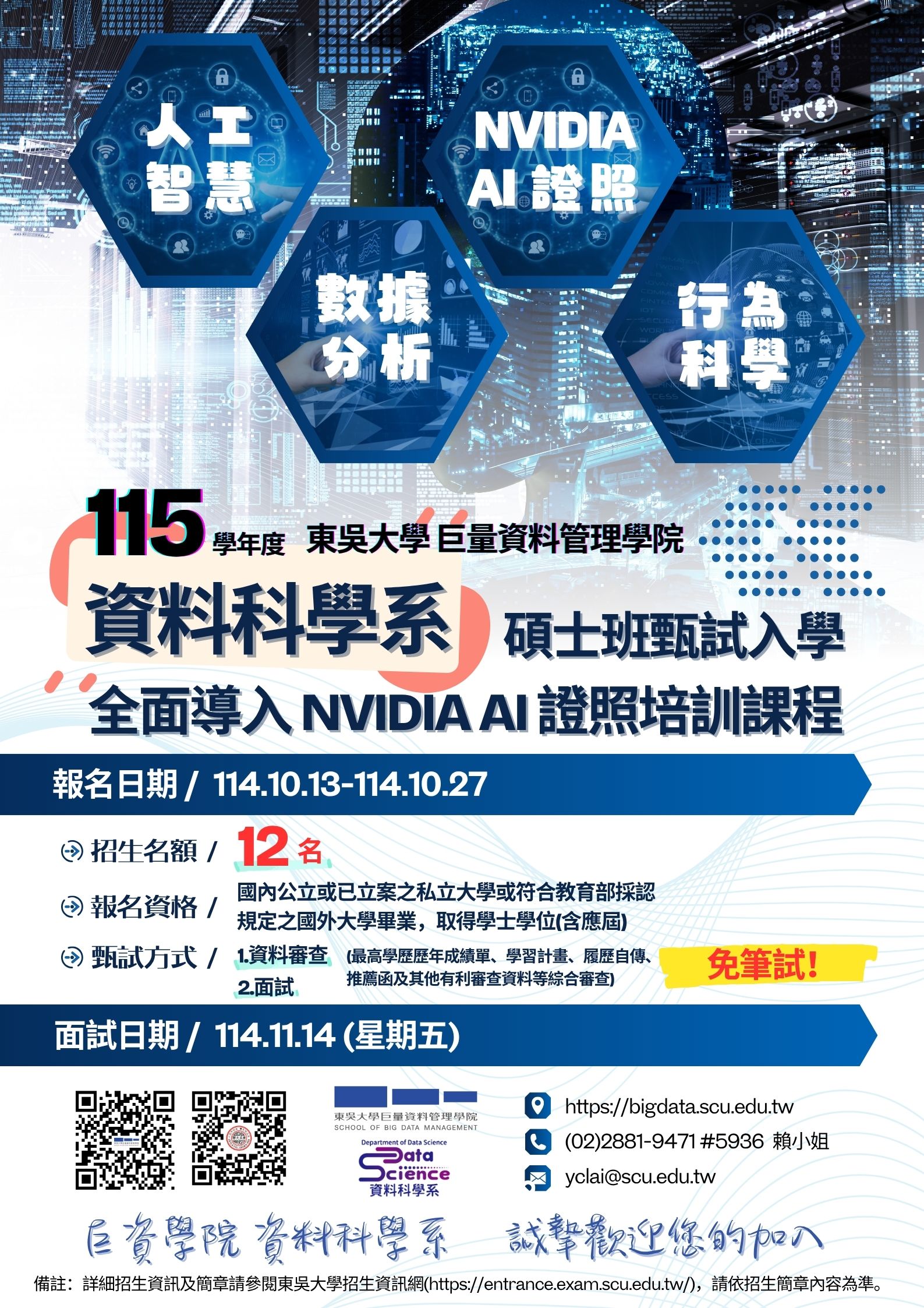 115學年度 東吳大學 巨量資料管理學院資料科學系碩士班甄試入學報考資訊