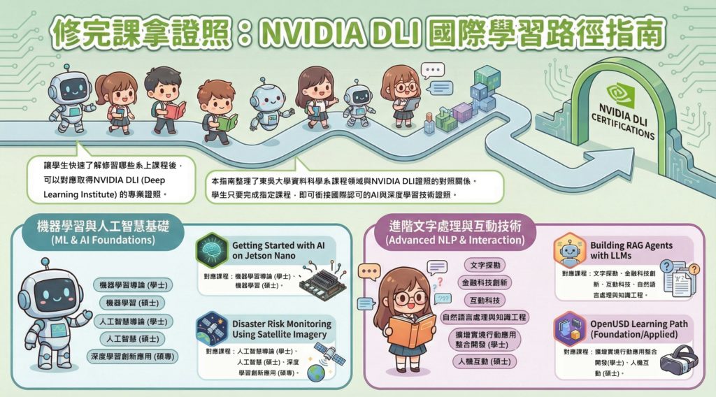 攜手 NVIDIA 打造 AI 實戰力 巨量資料管理學院資料科學系於課程設計中導入 NVIDIA Deep Learning Institute(DLI)國際專業課程內容,學生在修讀相關課程的同時,即可於課堂中完成訓練並取得 NVIDIA DLI 國際專業證照。透過結合理論教學與實作訓練,系統化培養學生在深度學習與人工智慧開發方面的專業能力,進一步提升其在全球 AI 產業與科技領域的競爭力,並共同推動具有特色的 「東吳 AI 智慧校園」。